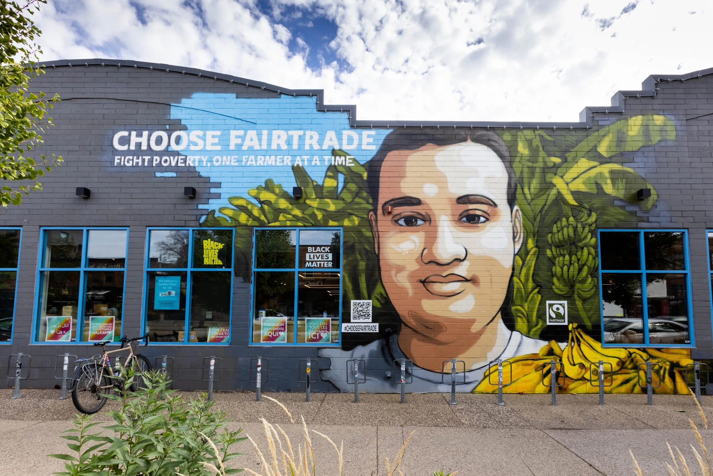 Johnny’s hard work and innovative spirit, combined with stability of Fairtrade pricing, has created a situation where he can really thrive as a farmer. To raise awareness on the importance of fair trading practices, and to elevate Johnny’s incredible work, we collaborated with Reggie LeFlore to create a mural at the Wedge Co-op in Minneapolis, Minnesota – where you can also conveniently find Fairtrade certified Equal Exchange bananas.