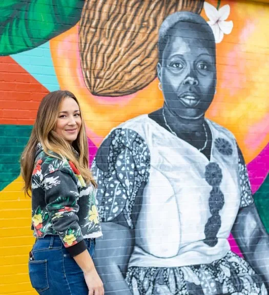 She is excited to generate awareness for Fairtrade’s important cause on such a prominent canvas — Turnip Truck’s exterior wall. As a proud member of the local community and loyal Turnip Truck shopper, Tarabella wanted to create a beautiful mural to honor Rosine’s beauty as a strong, independent woman. Rosine is the central focus of the mural, surrounded by vibrant colors and imagery of the cacao plant. The orange circle was inspired by the sunset but also serves as a halo around her. “The sun never sets on a badass!” says Tarabella.